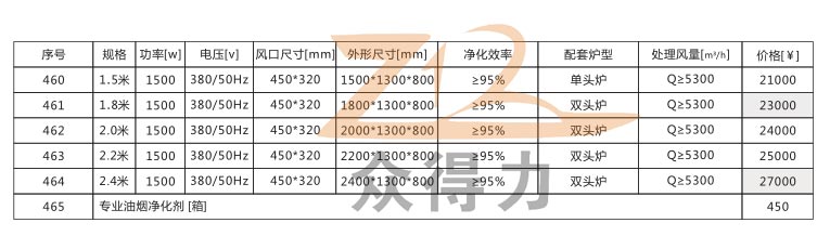 本系列油煙凈化一體機(jī)有1.5米、1.8米、2.0米、2.2米和2.4米五種規(guī)格,價(jià)格詳情請看下圖參數(shù):