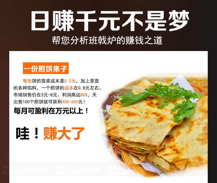 班戟爐是一種恒溫加熱,速熱快的美食設(shè)備,整機(jī)外殼采用優(yōu)質(zhì)不銹鋼材質(zhì),板材厚,加熱盤(pán)采用生鐵鍛造,表面光滑,食品級(jí)不粘涂層拋光處理,可加工制作各種煎餅。